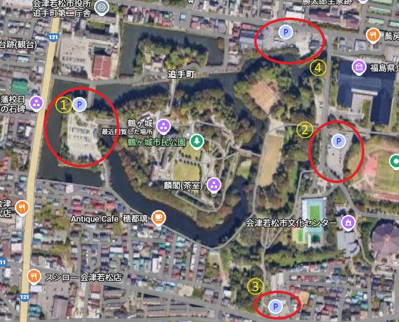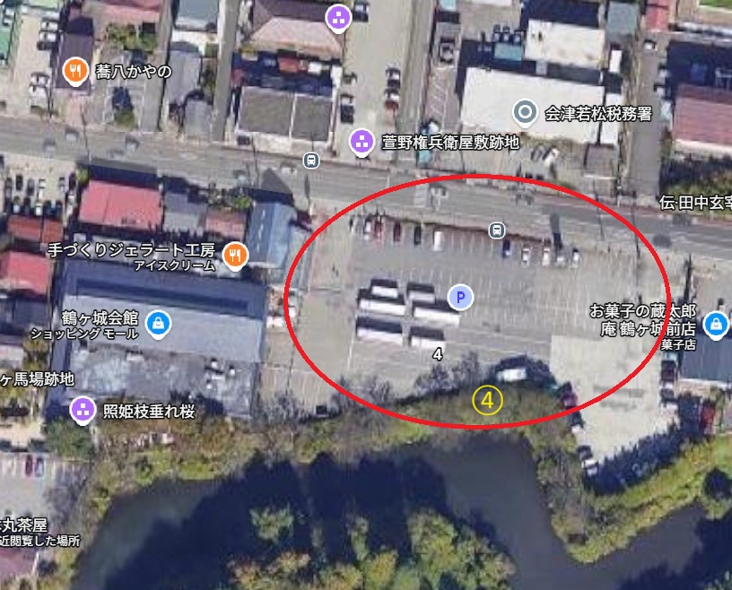 ④鶴ヶ城会館駐車場 乗用車:50台 大型バス:20台駐車可 料金・営業時間不明