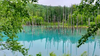美瑛にある青く染まった不思議な池、青い池についての営業情報・アクセス・駐車場・見所写真などを掲載しています。