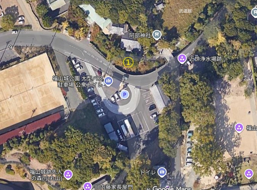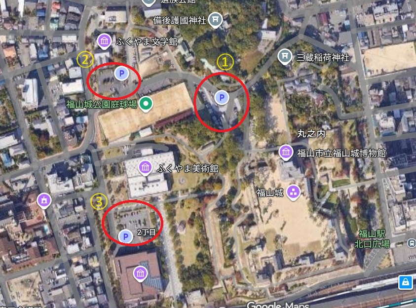 ①福山城博物館駐車場 大型バス:5台 普通車:29台 駐車可