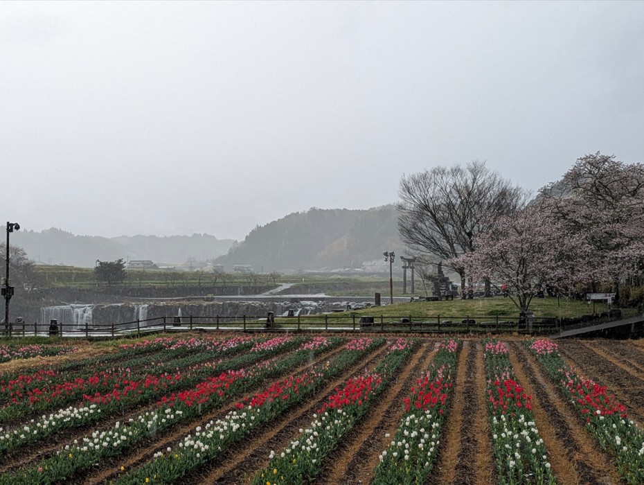 道の駅に車を停めて滝まで向かうのですがまず目に入るのはチューリップです。桜もわずかですが咲いていました。