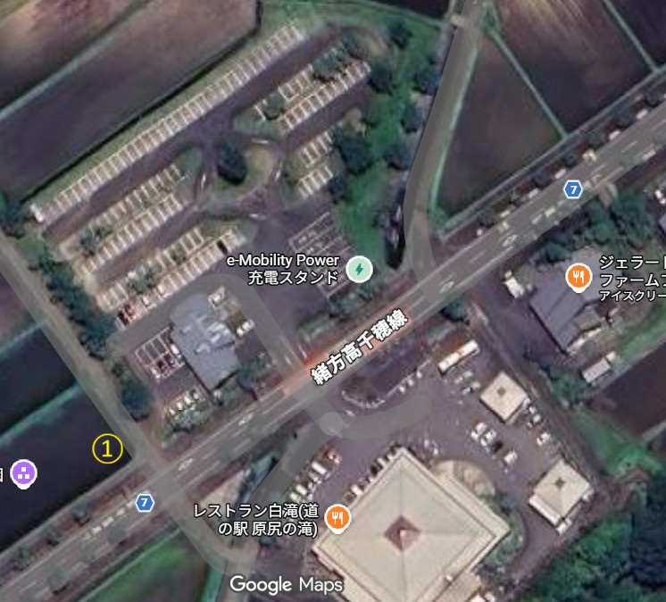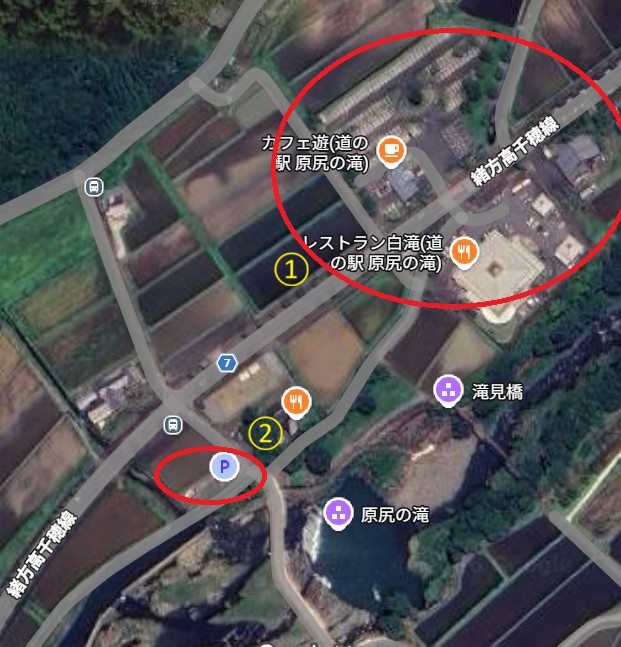 ①道の駅原尻の滝駐車場 大型車:5台 乗用車:110台駐車可
