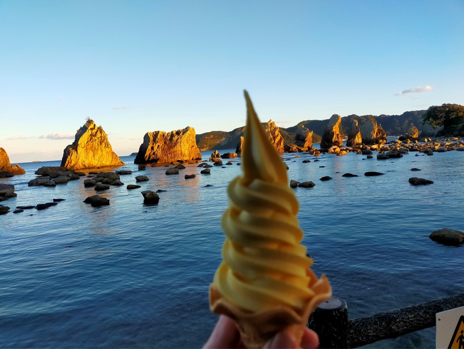 道の駅内にあったミカンソフトクリームを購入して食べてました。