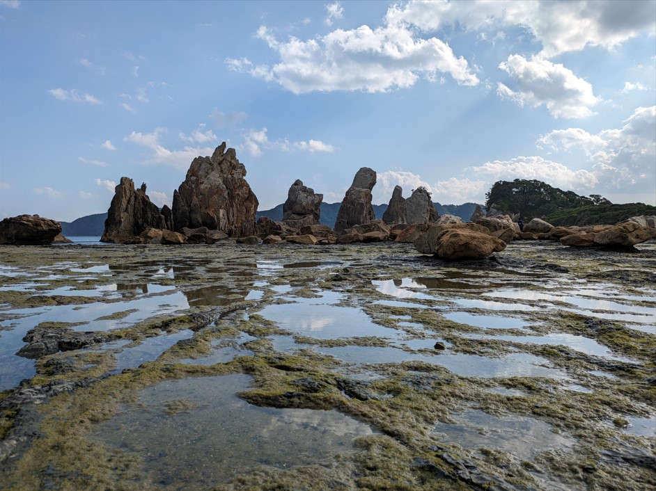 干潮のメリットは、岩を近くで見ることができるのと、弁天堂を観ることができることです。