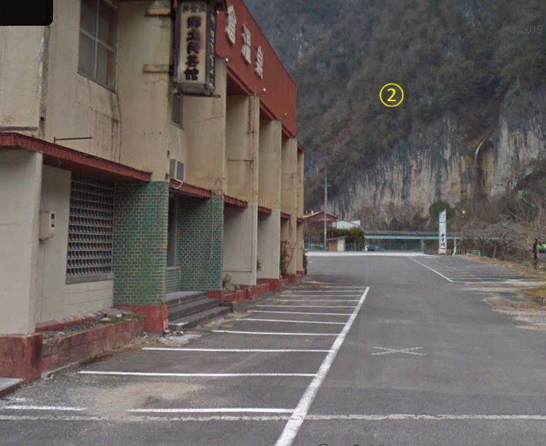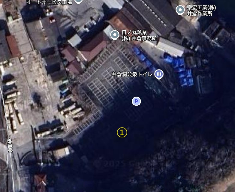 ①第一駐車場 200台駐車可、バスはこちら トイレあり 井倉洞までの距離は遠い