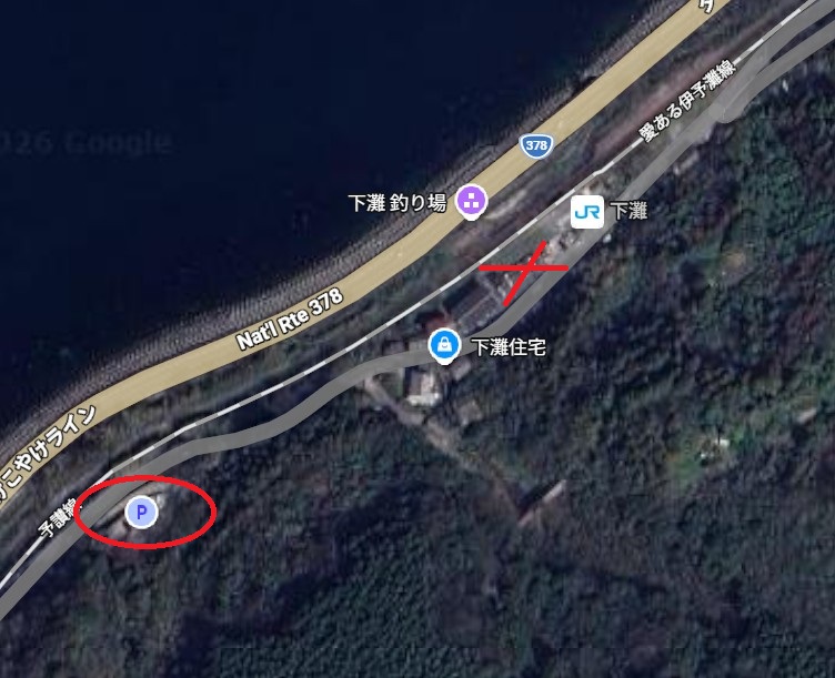 下灘駅すぐに6台ほど停めれるスペースがありますが(×マーク)