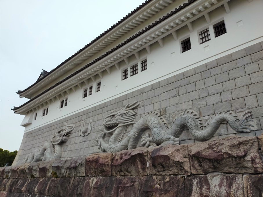 石垣には九頭竜川と、勝山市で発見される恐竜化石にちなんで9匹の龍が彫られています。