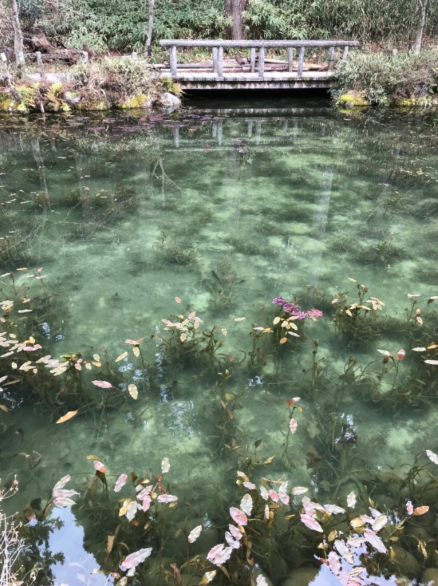 ・一年を通して見れますが、春から秋は睡蓮と透明な水、特に秋は紅葉。冬でも凍らずに睡蓮が咲く幻想的な風景になるそうです。