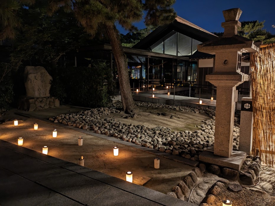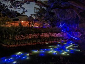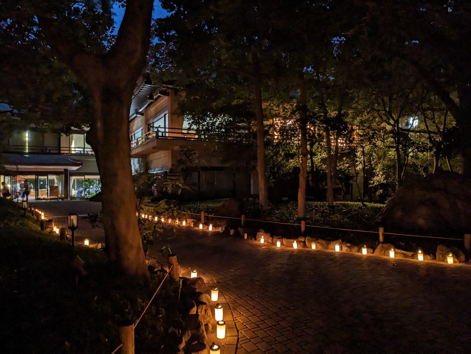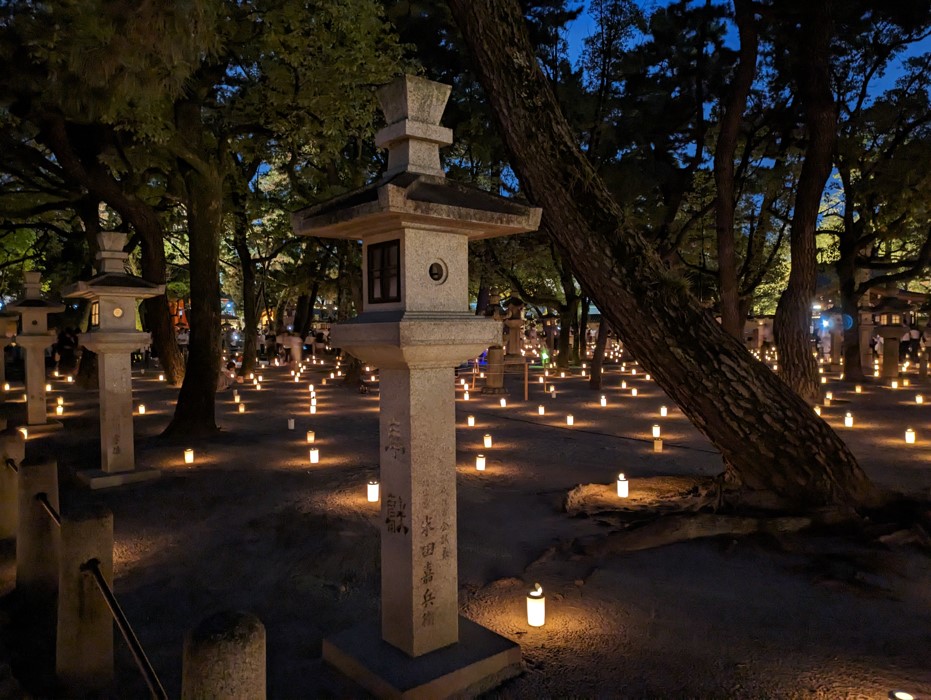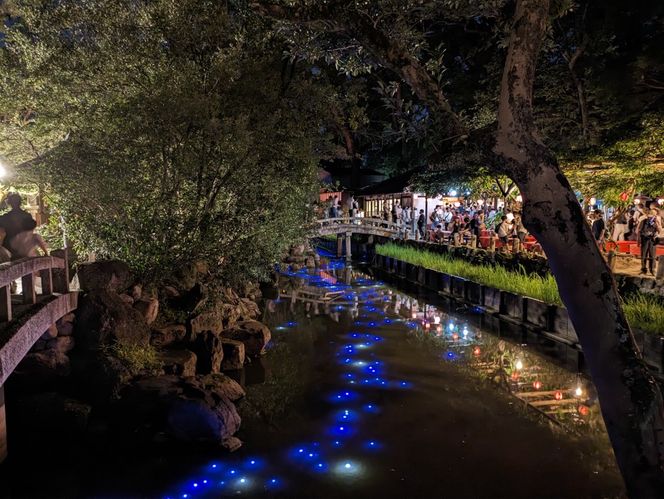 池に浮かぶ青い光がとても綺麗です。もちろん道中の灯ろうも綺麗です。