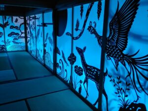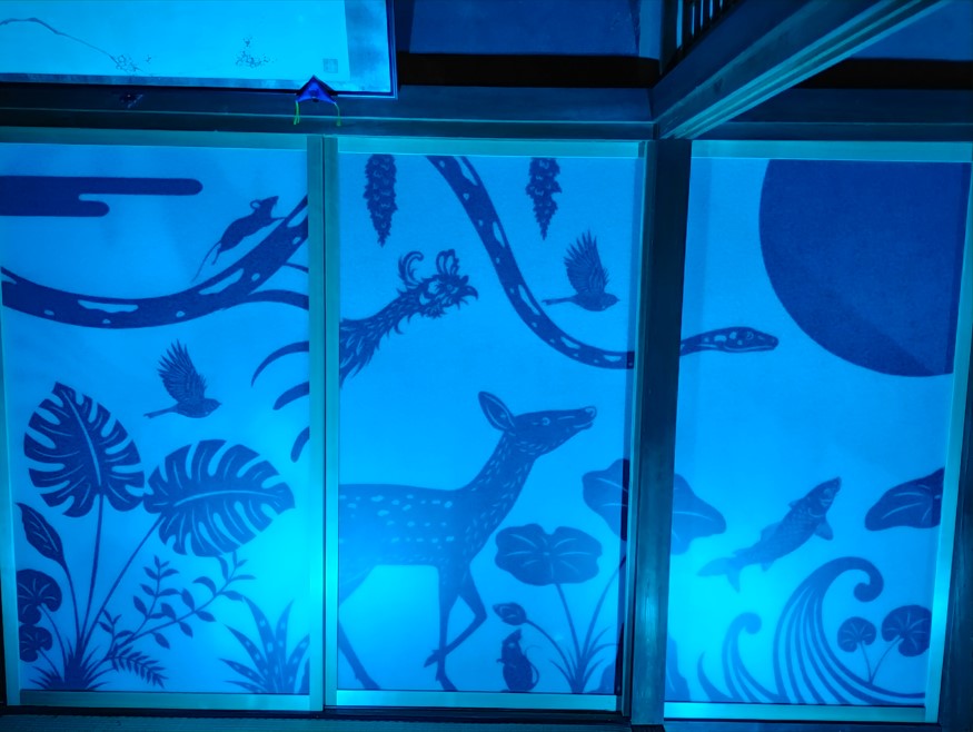 そして奥に見えている動物の襖がありますが、それが青色にライトアップされていてとても綺麗でした。