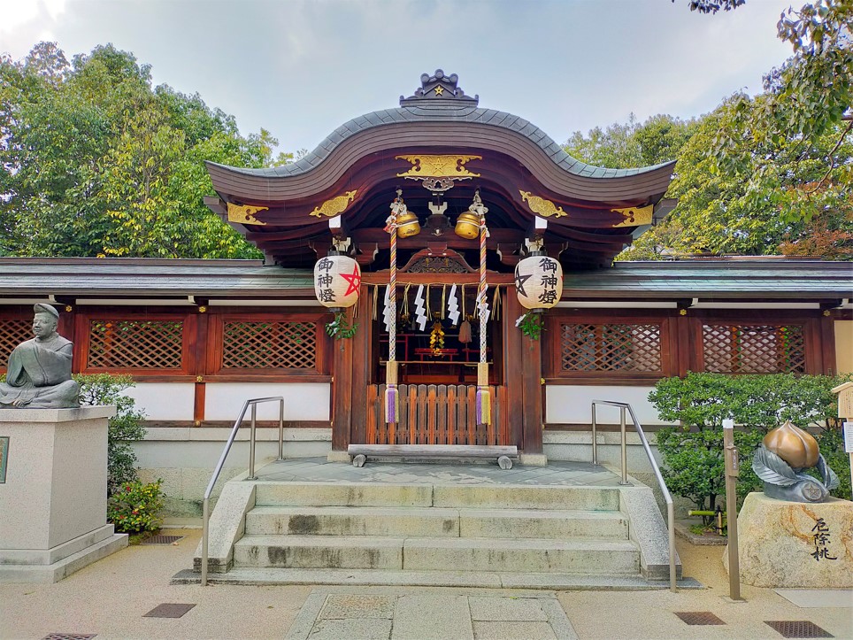 境内には安倍晴明公の像、厄除桃のモニュメント