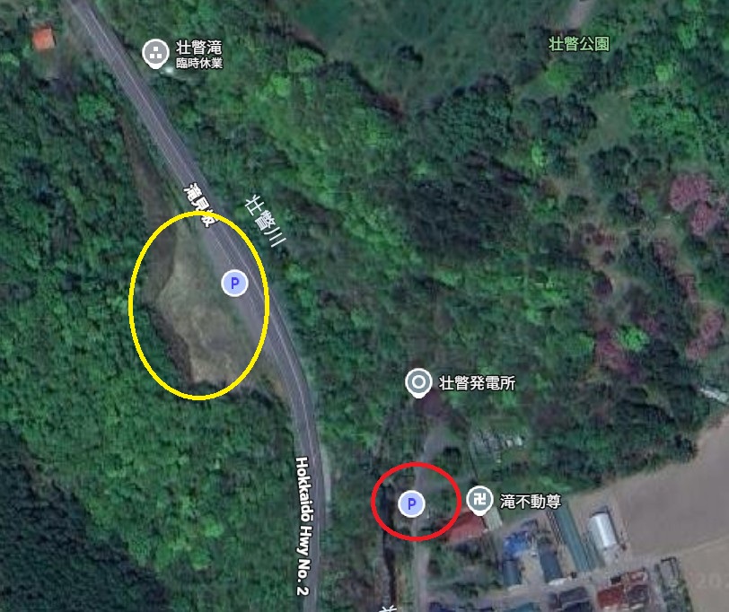 黄丸あたりは滝の上からしか見れない?赤丸から壮瞥滝遊歩道入り口に行けます。
