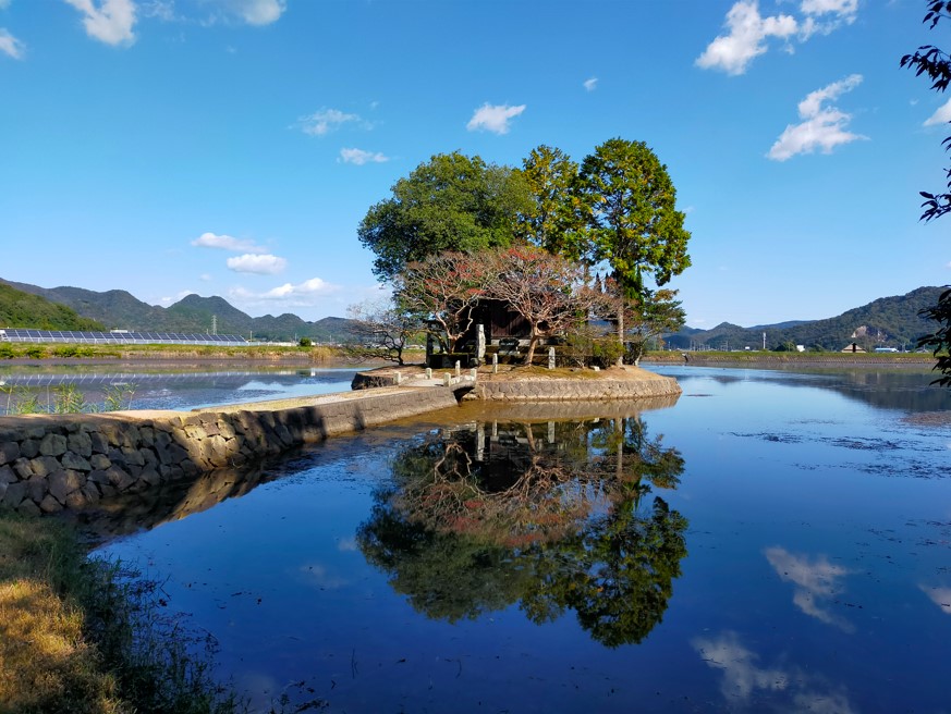 池にポツンとたたずむ神社