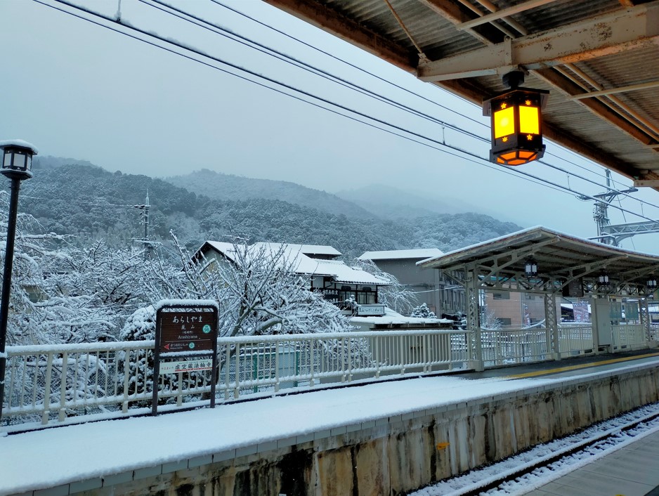 京都に来たあたりから雪景色になって行き、嵐山に着いた当たりではもう銀世界でした