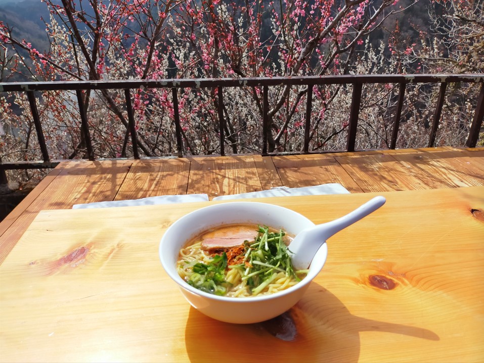 最初のビューポイントあたりの出店でラーメンを頼み、絶景を眺めながら食べていました。