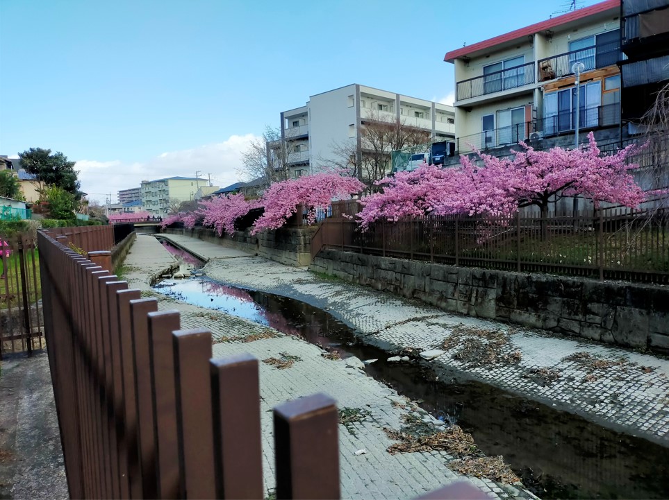 水路沿いにずらっと並んだ河津桜と住宅街を眺めることができます。