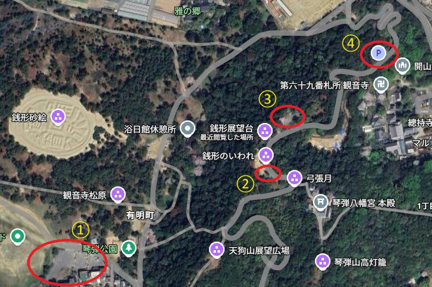 バス:JR予讃線観音寺駅よりのりあいバス(五郷高室線)利用、琴弾公園(森内科)下車、展望台まで徒歩約11分