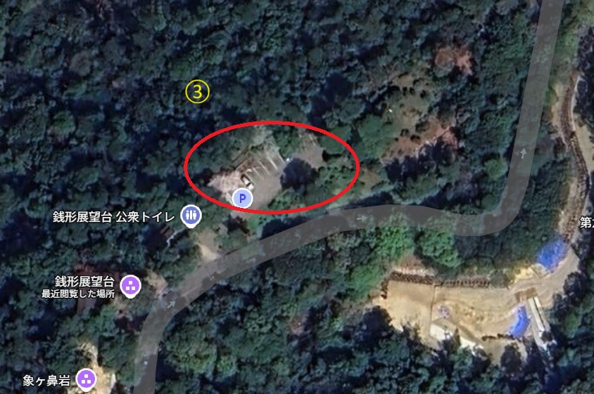 ②銭形展望台第二駐車場 5台ほど駐車可 うち2台障がい者用